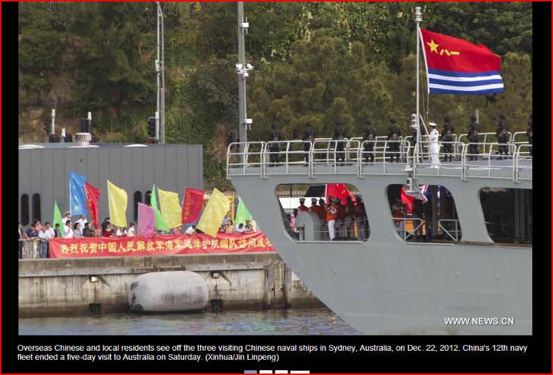 Here is a picture of the crowd greeting Chinese ships on a visit to Sydney. It certainly looks spontaneous. It almost makes you wonder if the crowd has been directed there to bolster the PLA Navy’s morale.