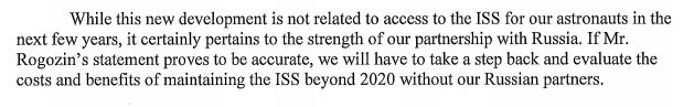 or…Congress reacts to the news that Russia is pulling out of the International Space Station in 2020 and fully plans to frustrate American intentions to continue with it.