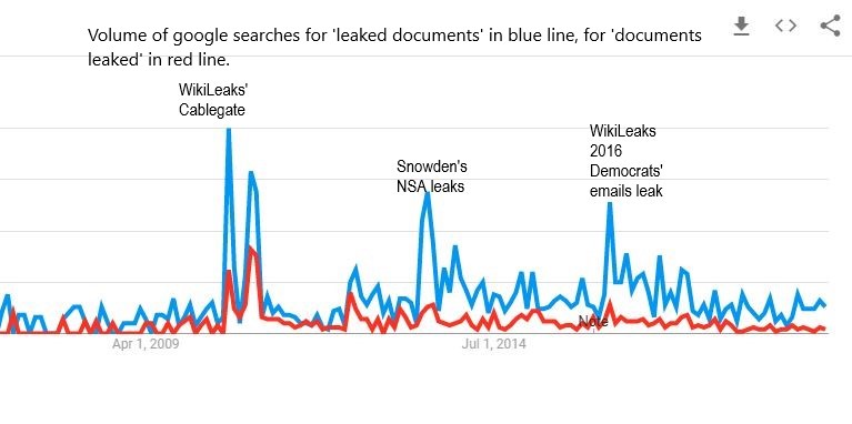 In the graph below, the first spike in 2010 is WikiLeaks’ Cablegate documents, the cache of State Department documents released to the world. The second spike, in 2013, is the Edward Snowden leaks of NSA documents. The third spike, is of course, WikiLeaks intervention (with Russian backing) in the US presidential election in 2016.
